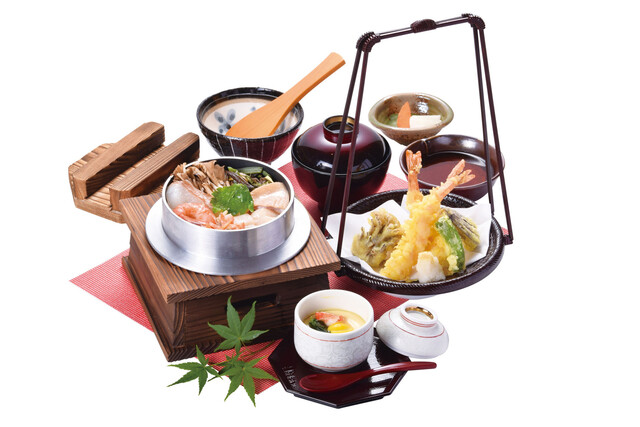 おこわ釜めし天ぷら御膳(1958円) 具だくさんの厳選素材をふっくらもちもちに焚き上げた釜めしです。釜めしは、選択もでき、【舞茸おこわ、五目おこわ、しらすと梅おこわ】から一品お選びいただけます。