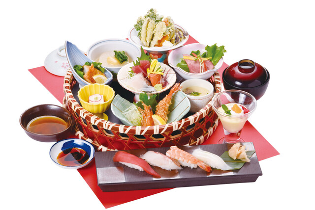 花かご寿司御膳(2860円) 華やかに和食のフルコースを盛りつけられた満足の一品です。天ぷらやおそばもついてバラエティ豊かな味わいをお手頃価格で楽しむことができます。