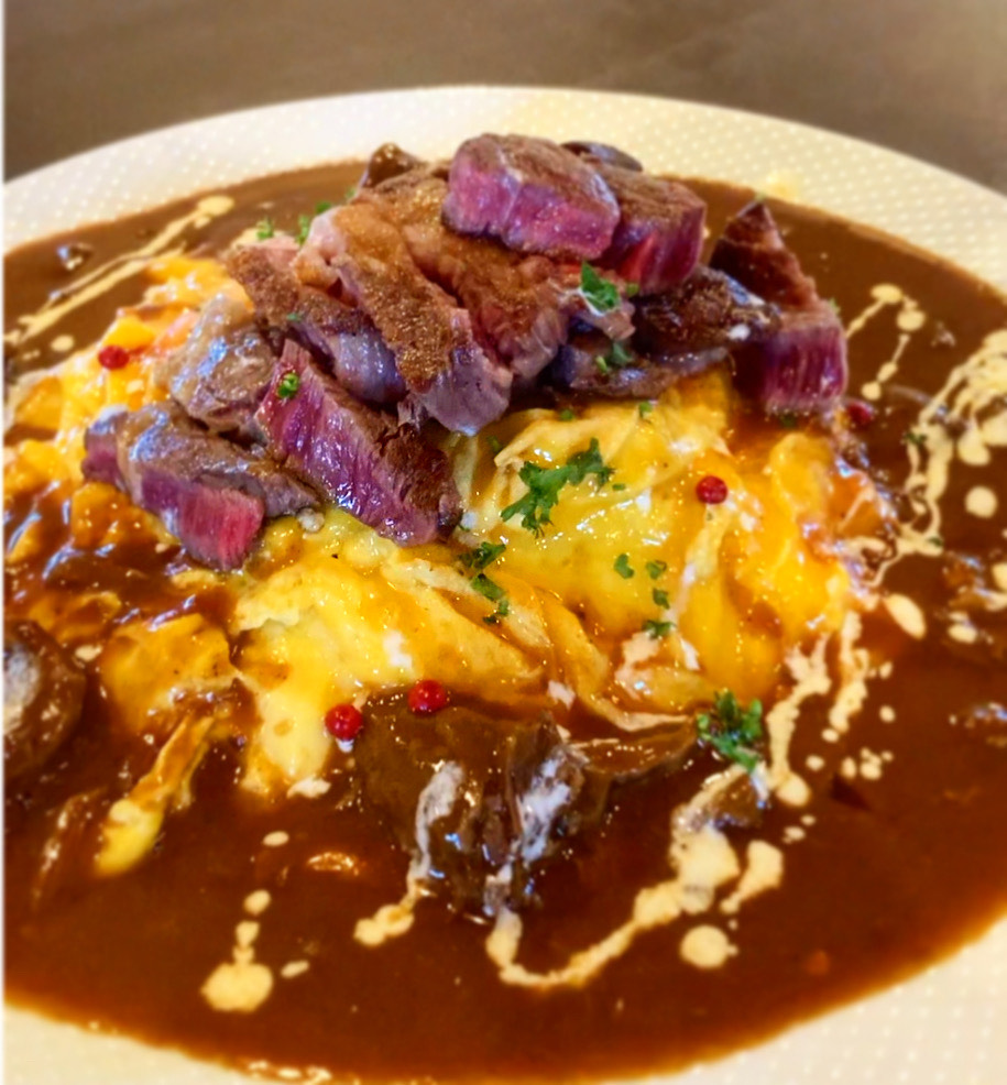 富士山オムライス( 3776円) 富士山の風土に育まれた食材でふじ玉子と富士山麓牛と恵まれた水で炊き上げたごはんで作るオムライスは正に富士山オムライスとのこと。通常サイズの1.5倍のオムライスを富士山に見立てて麓には牛タンとすじ肉のビーフシチュー頂上には富士山麓牛のステーキとボリューム満点!