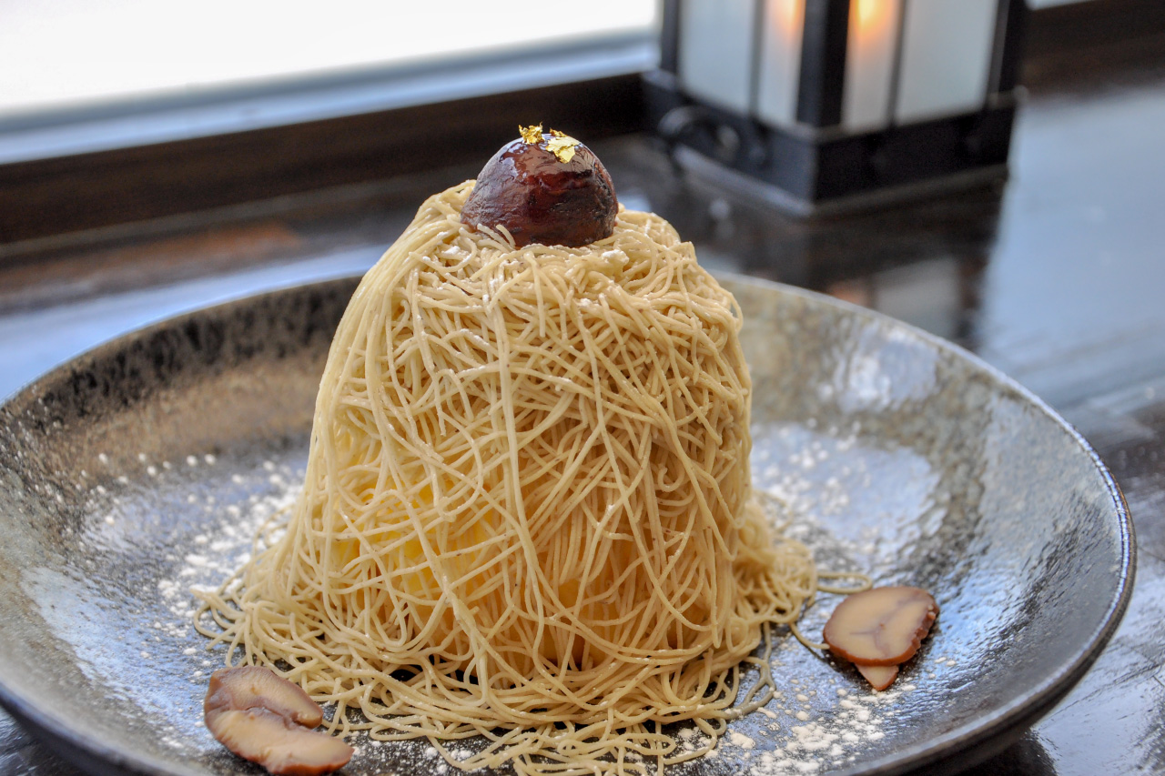 錦糸モンブラン(1430円) 店内はオシャレで落ち着いています。アイスコーヒーにほうじ茶はセルフサービス。見た目のボリュームもあり、SNS映え間違いなしです!